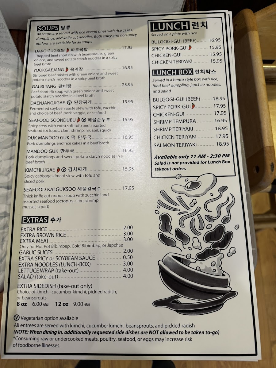Lunch Menu, available from 11:00 AM to 2:30 PM, offers a combination of meat and rice options including bulgogi, galbigui, jaeyookgui, chikengui, and chicken teriyaki, providing a convenient meal for midday diners.